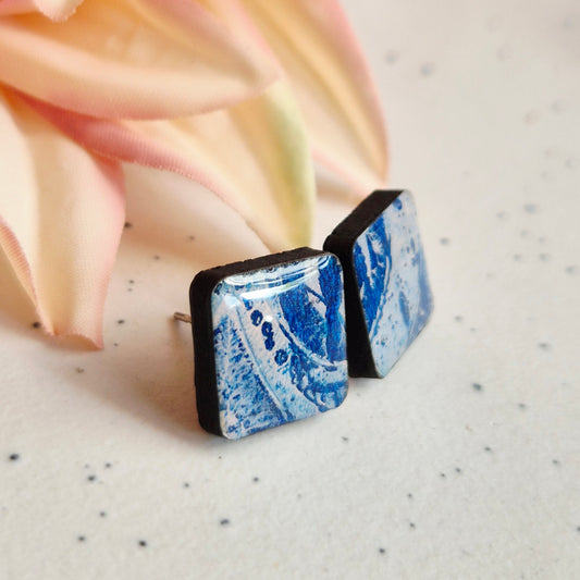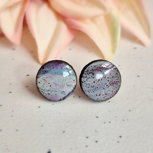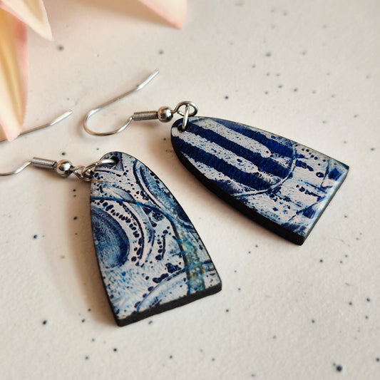 Created from my own original gel plate prints and transformed into gorgeous jewellery, these earrings and brooches are all one-of-a-kind and unique.