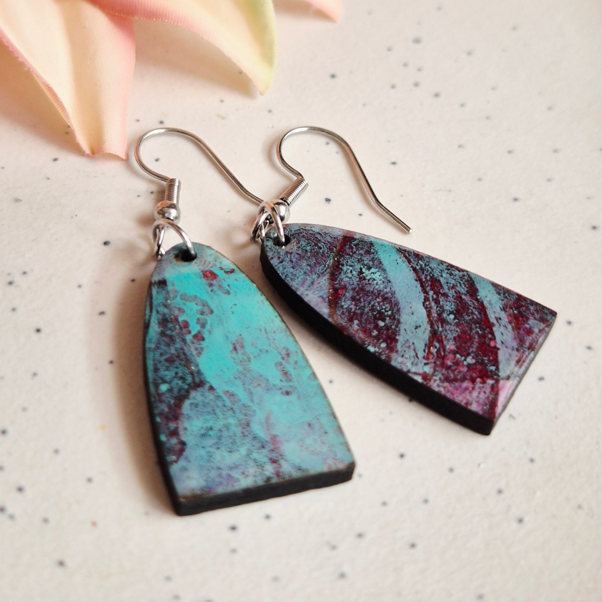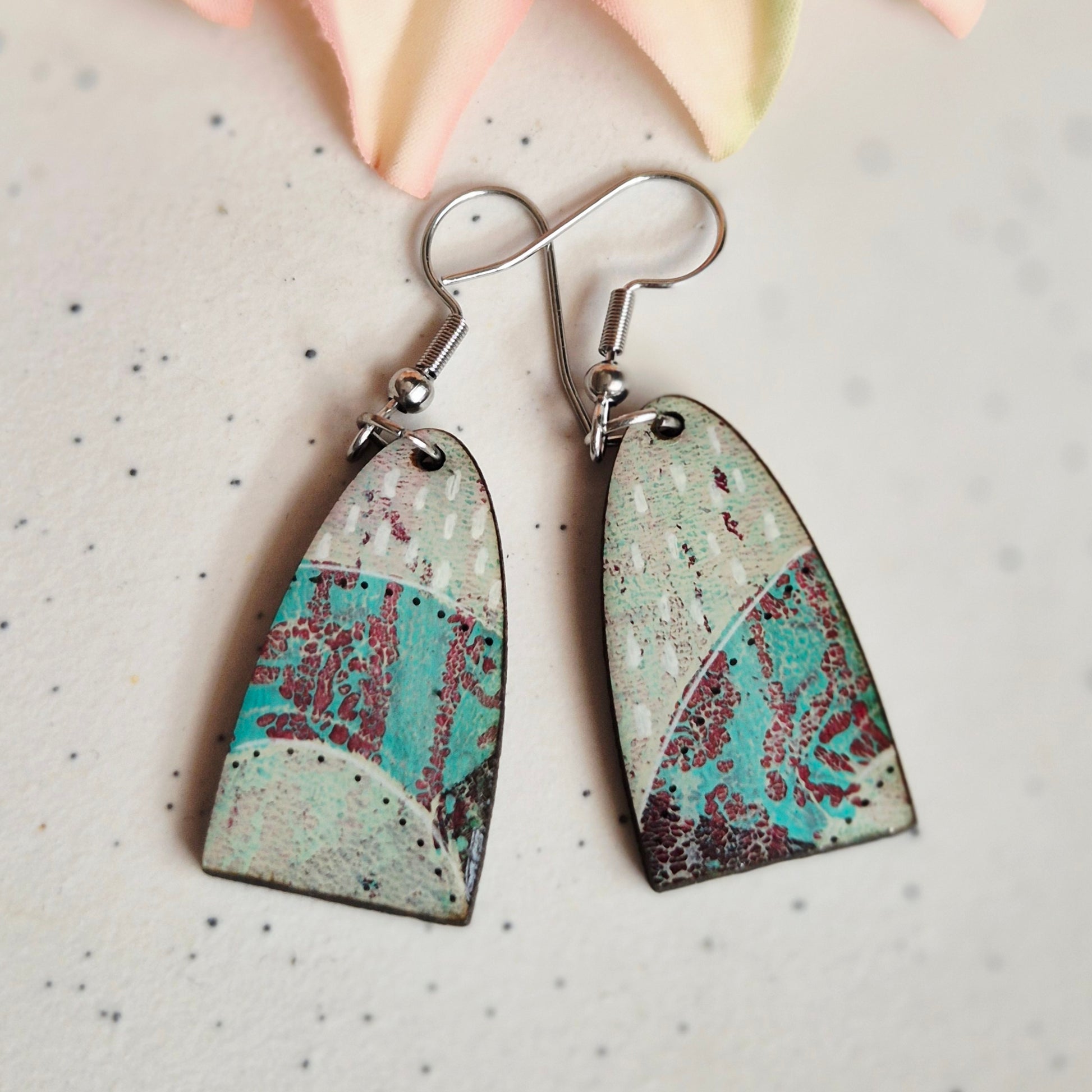 Created from my own original gel plate print (Turquoise and purple with black/white art pen details) and transformed into gorgeous drop earrings, these Gel Plate Arch Drops are all one-of-a-kind and unique.