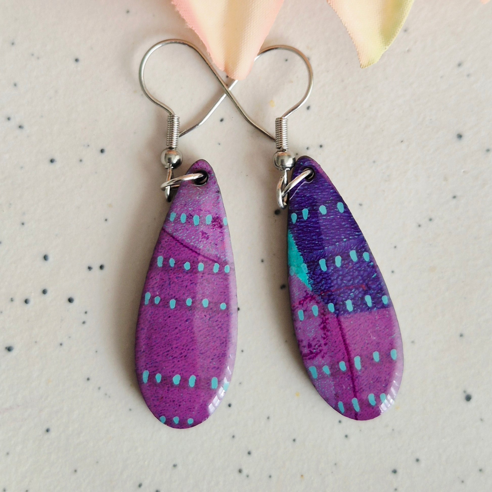Created from my own original gel plate print and transformed into gorgeous drop earrings, these Gel Plate Droplets are one-of-a-kind and unique.