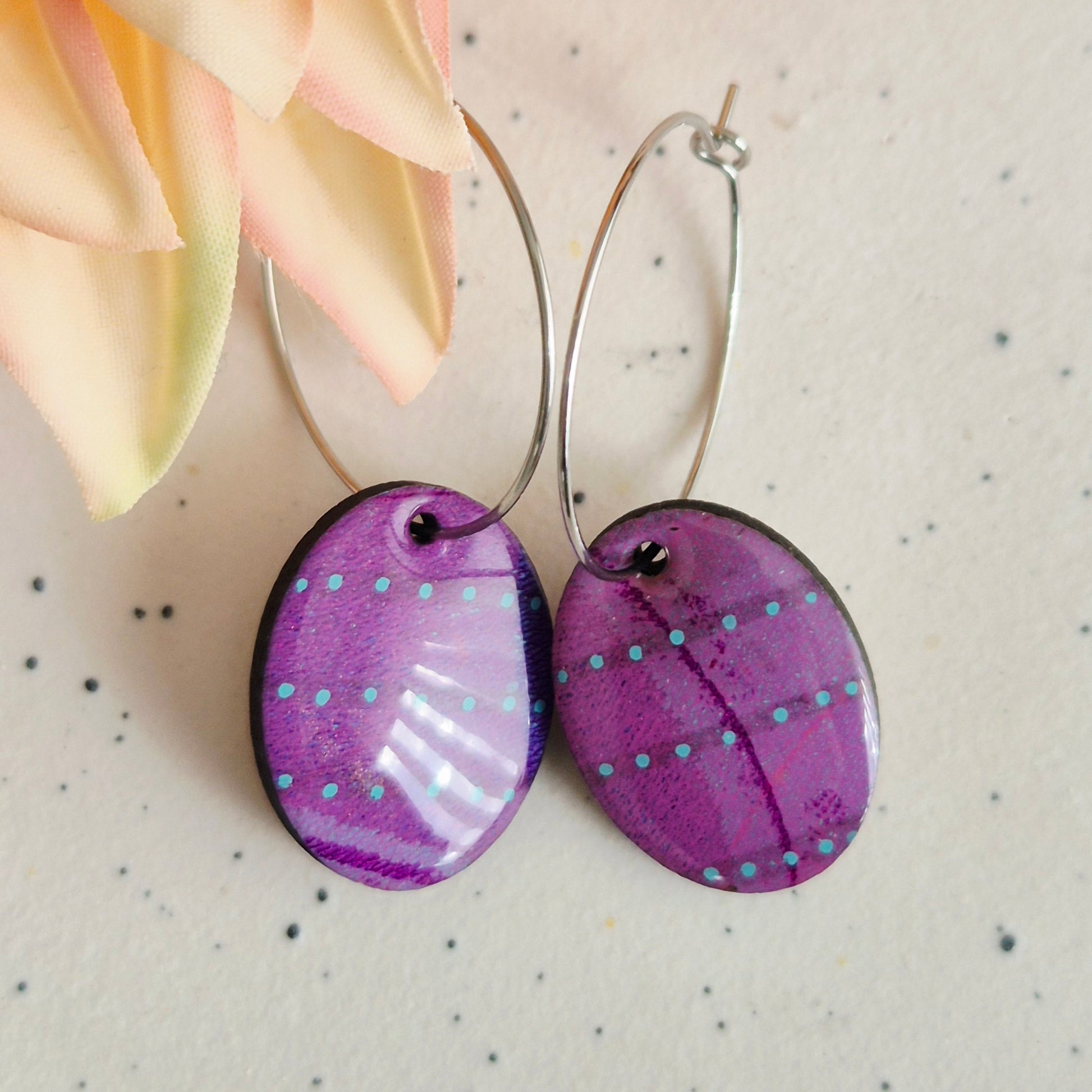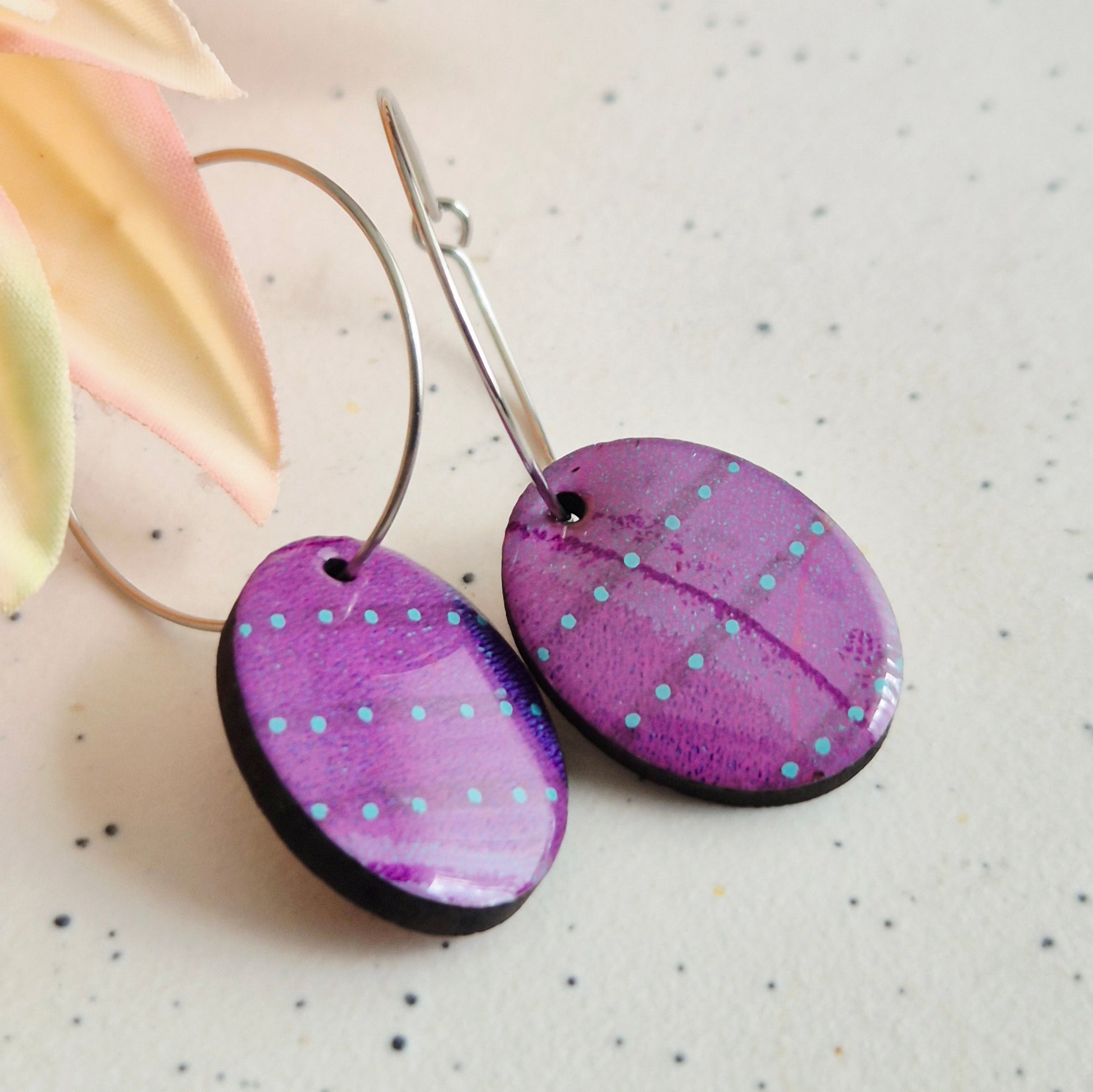 Created from my own original gel plate print and transformed into gorgeous drop earrings, these Gel Plate Hoops are all one-of-a-kind and unique.