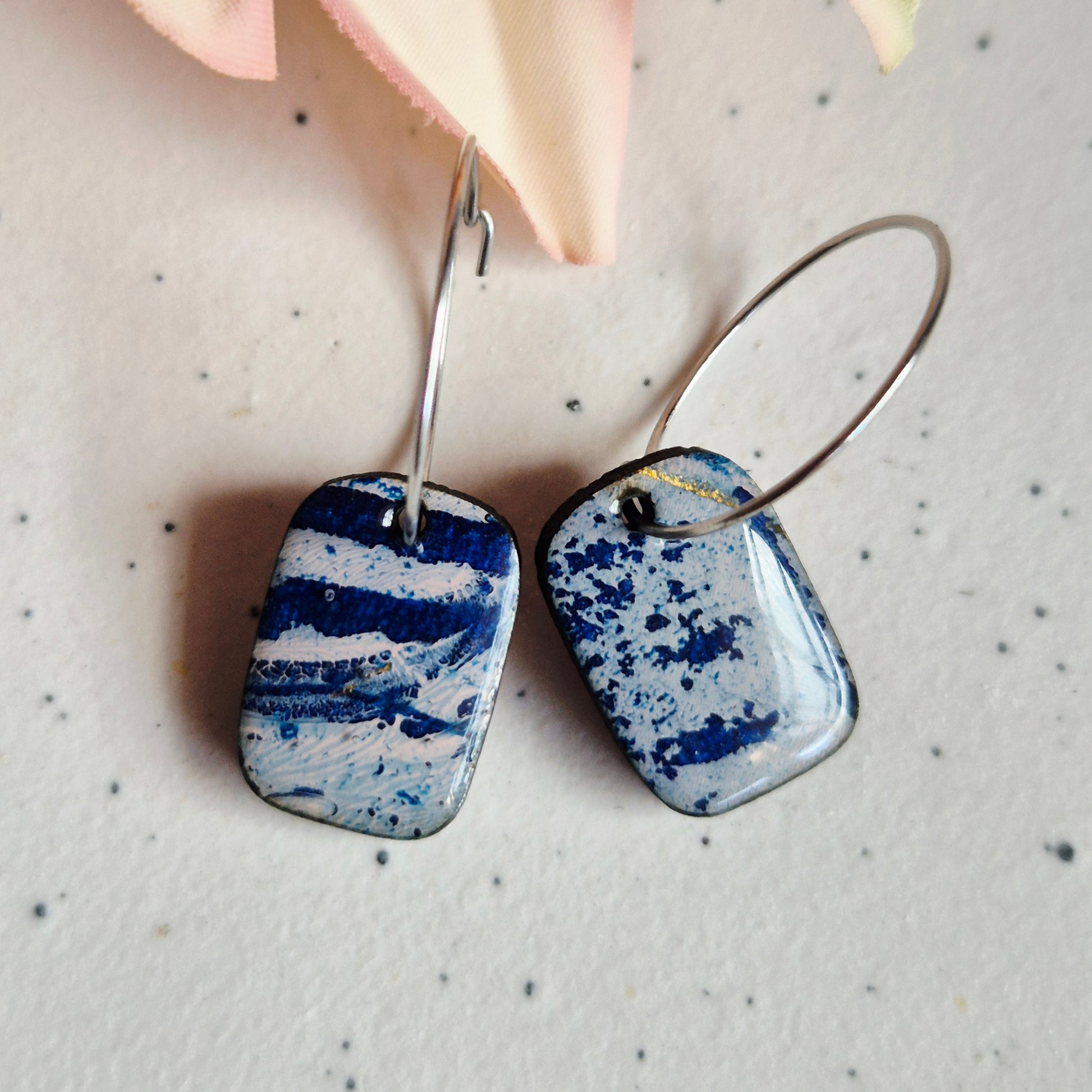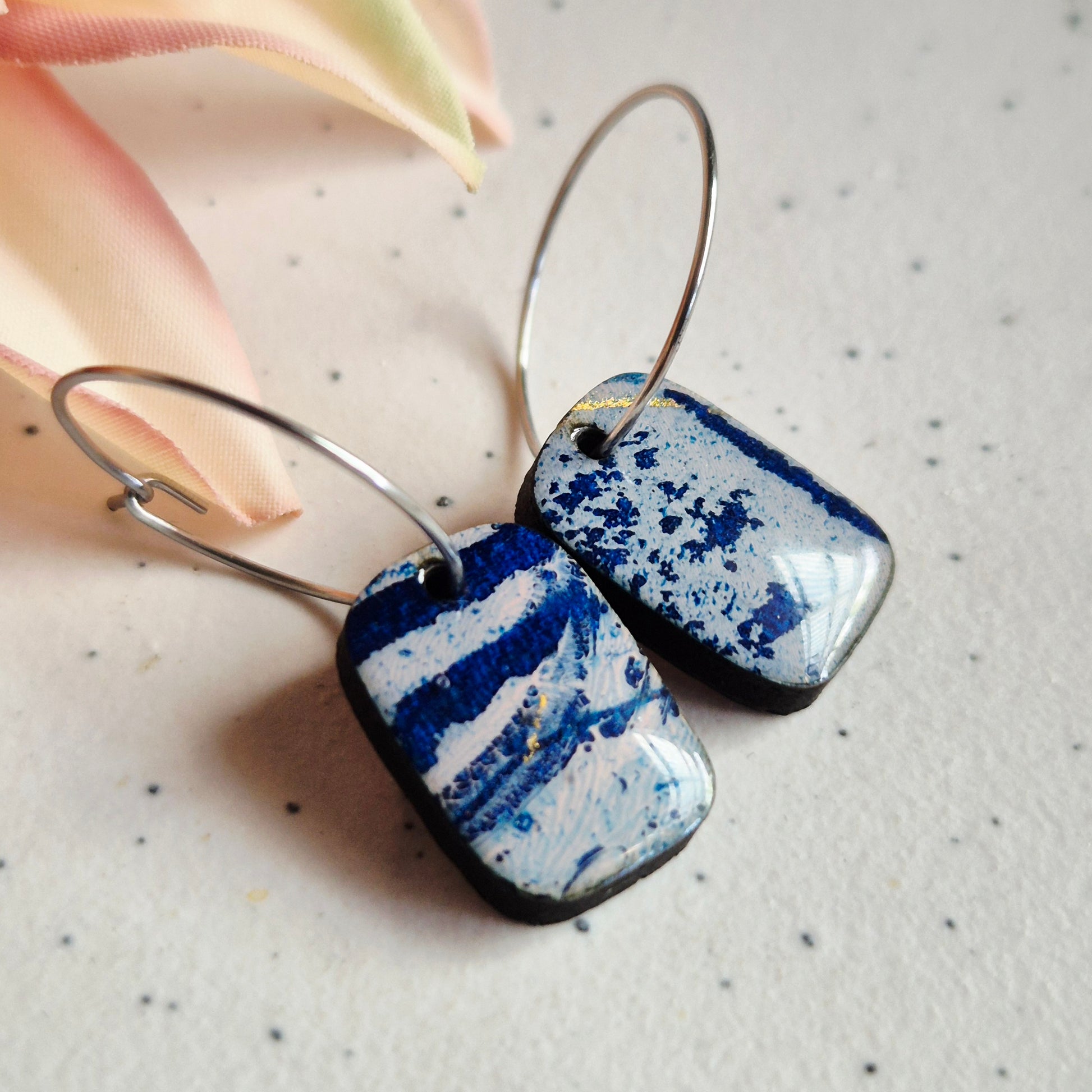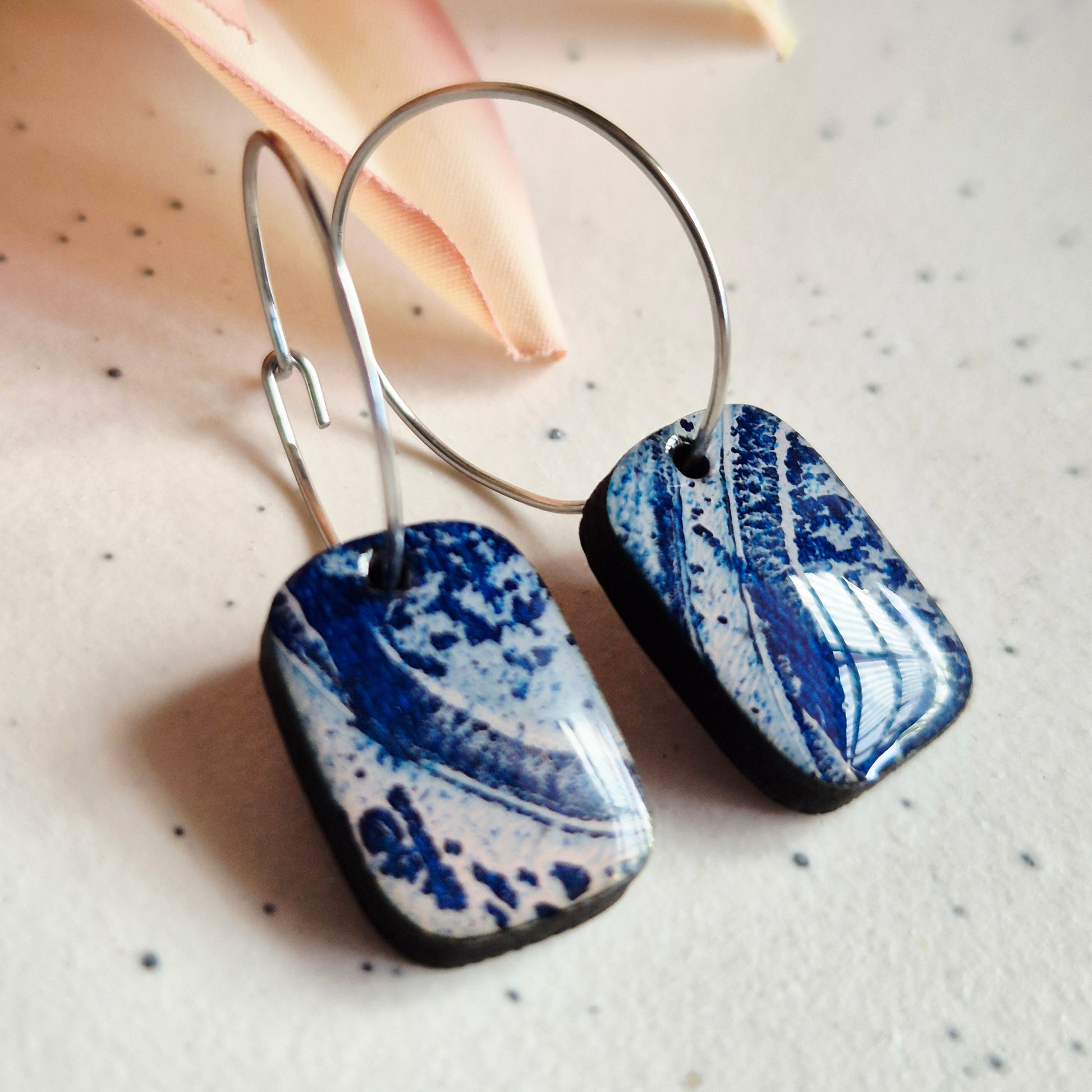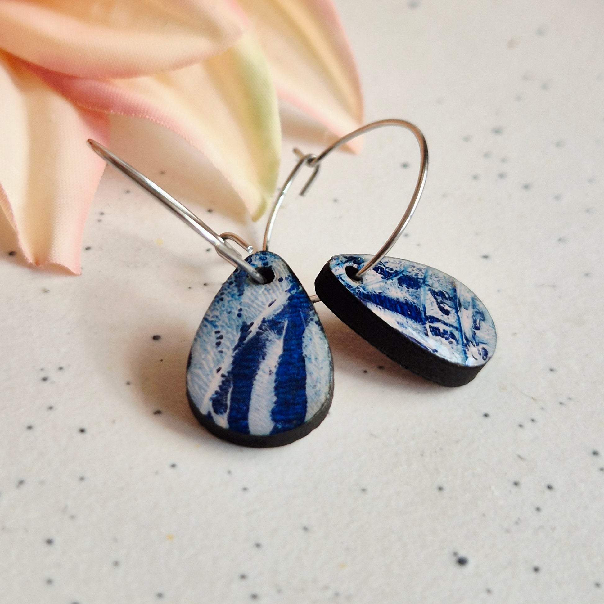 Created from my own original gel plate print (Blue and pink) and transformed into gorgeous drop earrings, these Gel Plate Mini Hoops are all one-of-a-kind and unique.