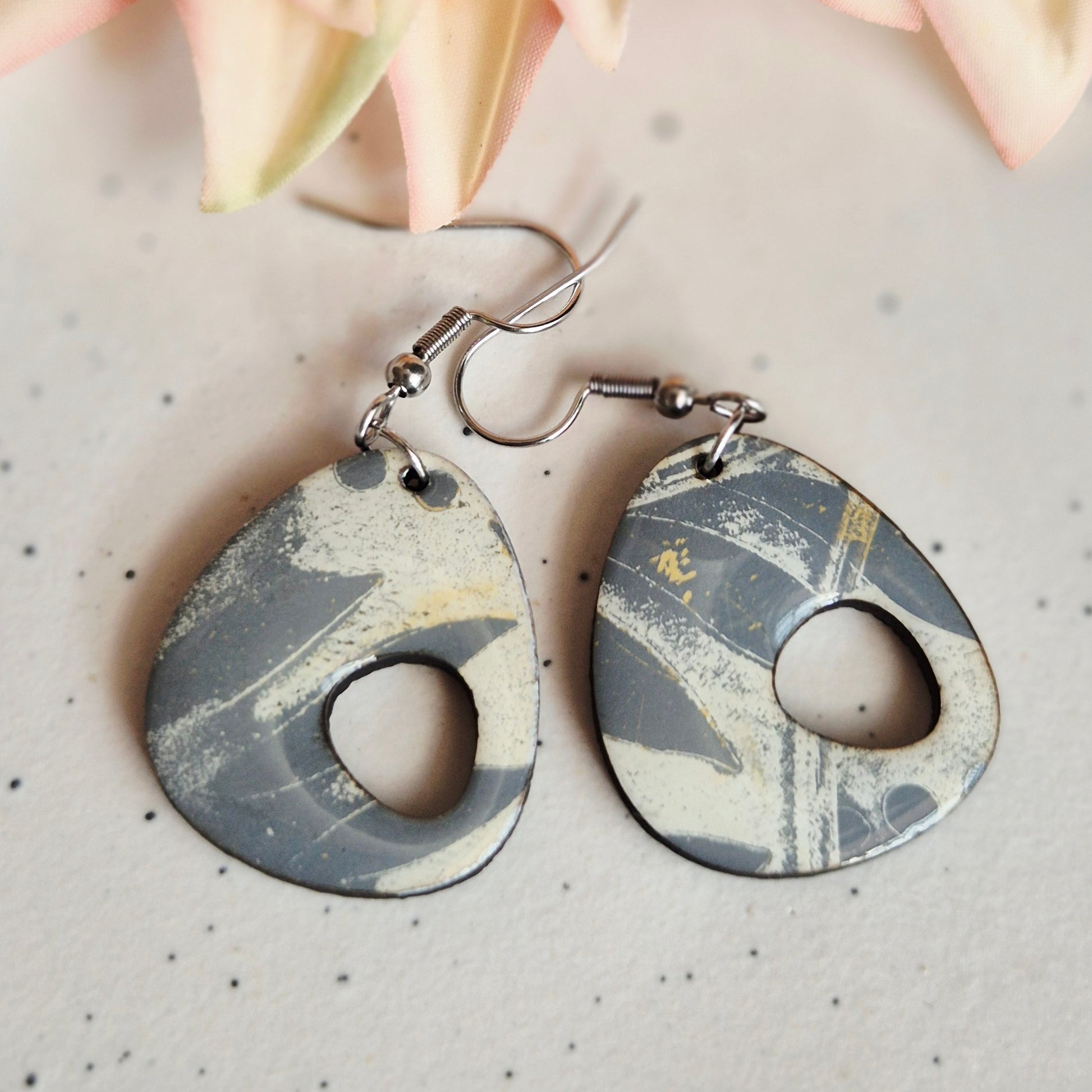 Created from my own original gel plate print (Yellow, white, grey) and transformed into gorgeous drop earrings, these Gel Plate Open Organic Drops are one-of-a-kind and unique.
