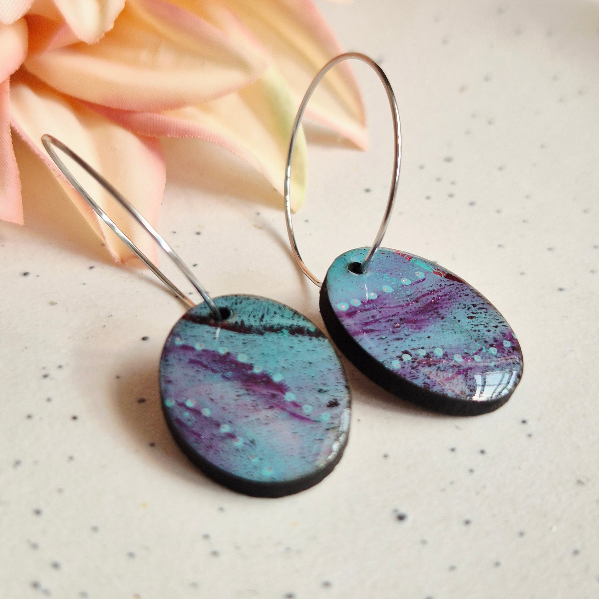 Created from my own original gel plate print (Turquoise and purple) and transformed into gorgeous drop earrings, these Gel Plate Oval Hoops are all one-of-a-kind and unique.